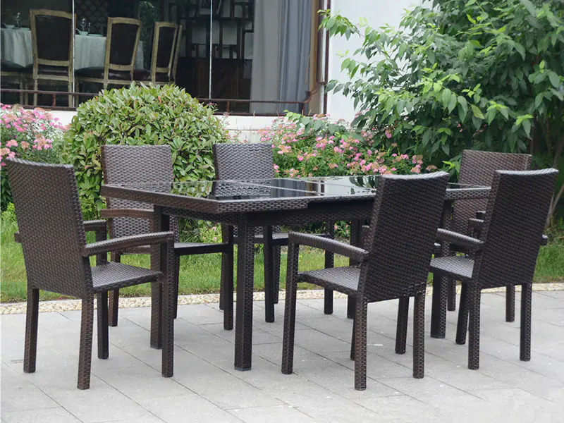 Aluminium fistulam plana pe rattan, 1table, 6chairs; Tractus Tabula: CCIX / CLXIV * W90 * H75cm, 5mm temperatum nigrum vitrum; Cathedra, l58 * W57 * H90cm; | CLXVII * XX * 93cm / 1table in carton; 27pcs cathedra / grabatum | 108sets |