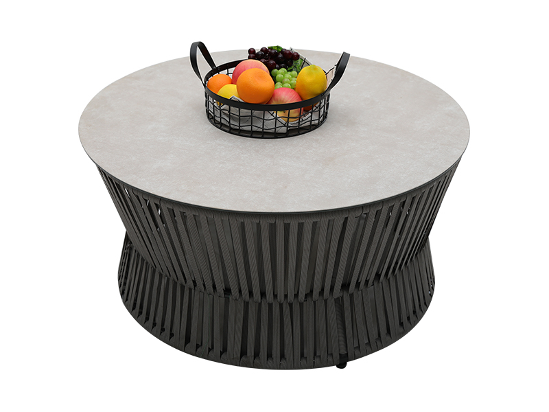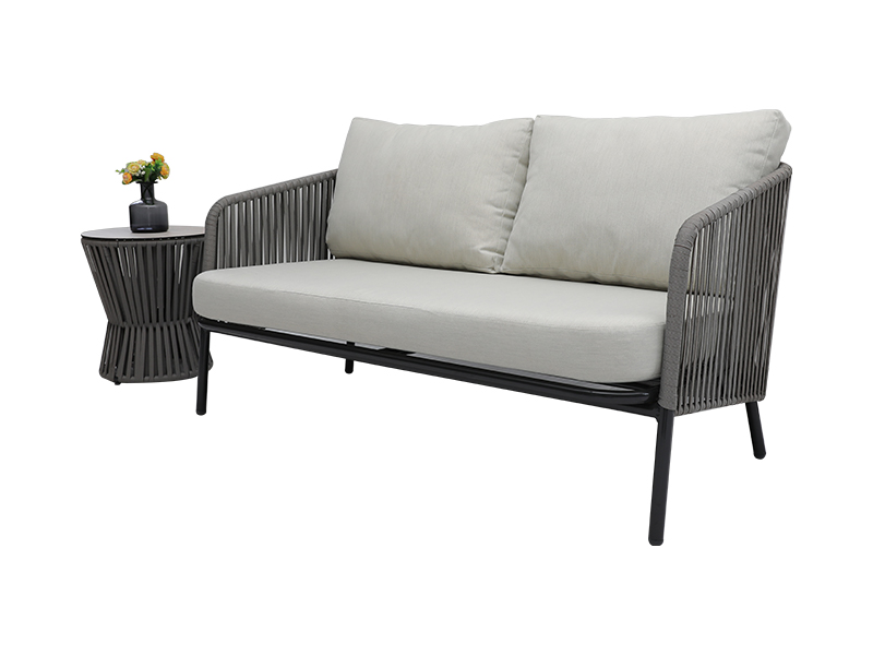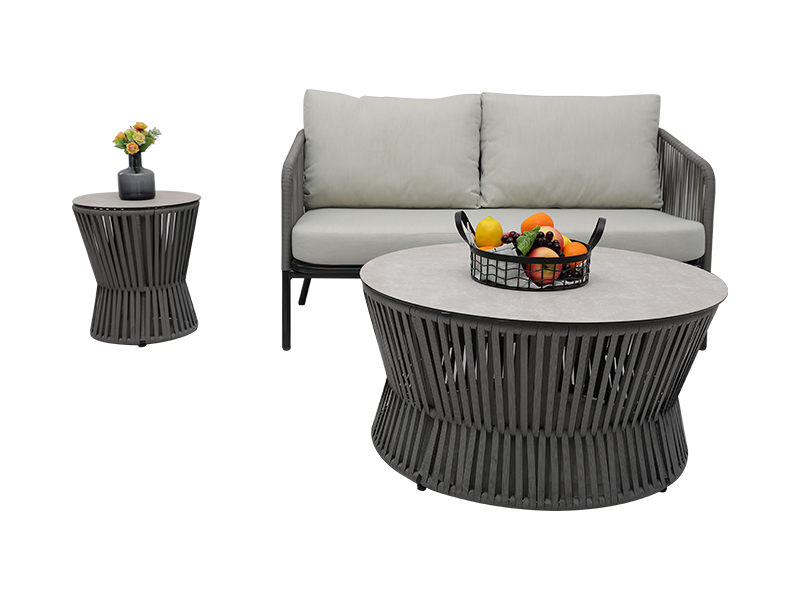 | Specification | aluminium artus plano funiculo tripedali, 10cm pulvinus sedile spongia intus, pulvinus dorsum cum fibra intus implens, 230g/m2 pulvinus polyester fabricae; single chair: L82*W75*H69cm, 2pcs; loveseat chair: L82*W142*H69cm,1pc; capulus mensam: ∮85*H43cm, 6mm vitrum in Ceramico nixum; Mensa lateralis: ∮42*H48cm, 6mm vitrum secundum Ceramicum |
