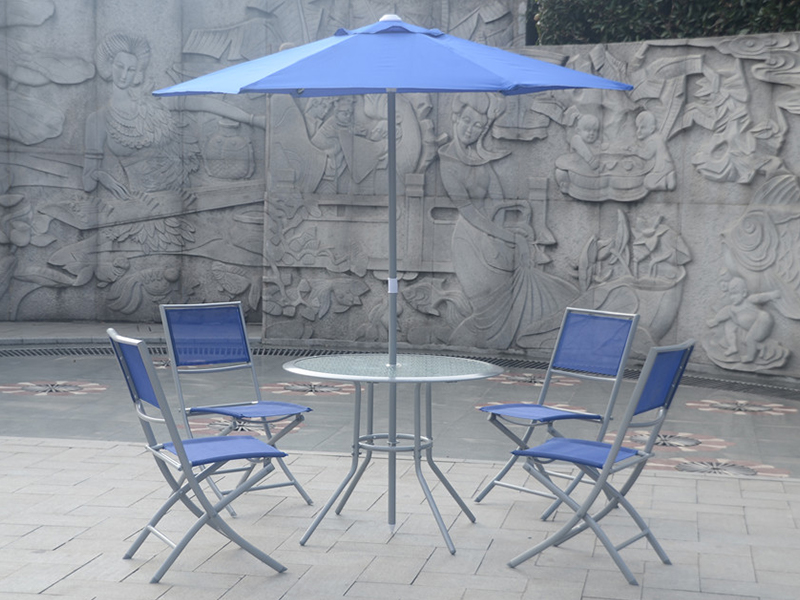 | 6PCS SET(1table, 4chairs et 1 umbella) Tabula:φ90×H70CM, tabula aluminium tabulae & tubi ferrei tabulae cruris, 5mm laniatus vitreus temperatus; Cathedra:58.5×44.5×87CM, tubus chalybeus cum 1×1 textile umbellae fabricae: φ2M, 6ribs, D32/32㎜ polus, 160G terylene fabricae, tubus ferreus | 115×26.5×99CM / unaquaeque sella et umbella tum mensa in polybago, tum tota in craticula conlocata. | 216SETS |