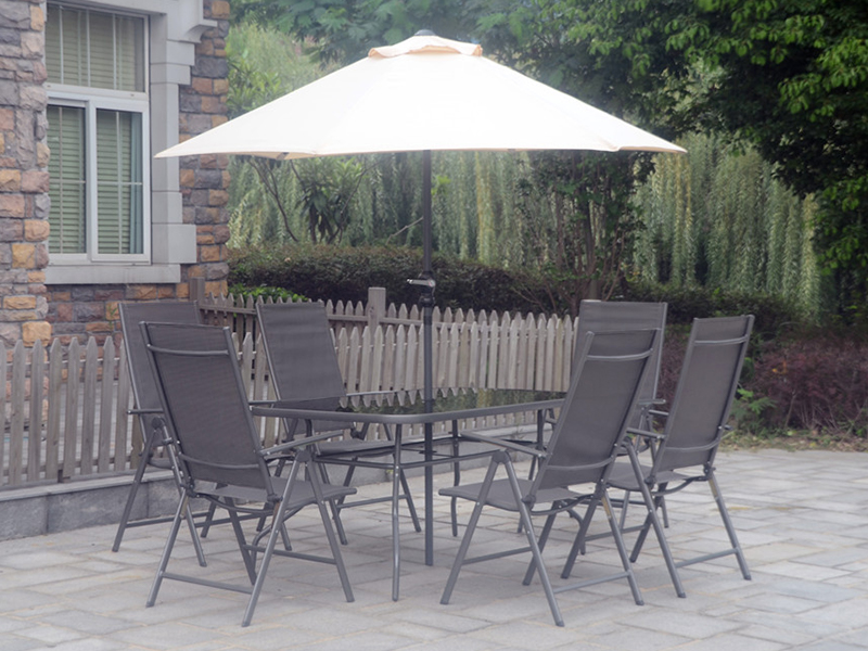 | 1tabula, 6 sellae plicae et 1 umbellae, cochleae galvanatae, 7-sellae positio: L62*W55*H108CM,2*1 textile textile, tubus ferreus; table:L142*W90*H71CM, tubus chalybs, 5mm nigrum vitreum temperatum cum umbella in medio foraminis; Umbrella:DIA2.7M, cum rocker et crank, costae 6 ferreae, D38MM alu. polus, 160g fabricae; | 144*7.0*93cm/1able in cista; 58*26.5*93CM/ cathedrae in cista; | 122SETS |
