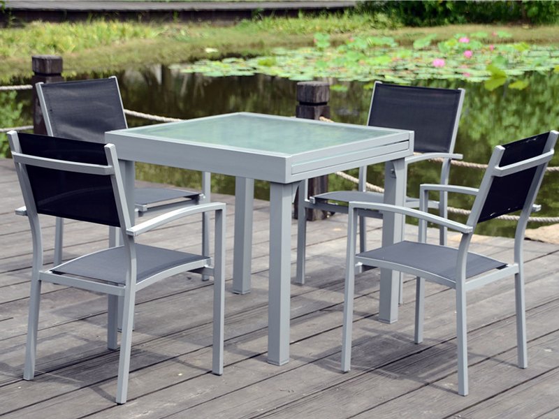 | extensio table:L90/180*W90*H75CM, 5mm eget vitrum temperatum, tubus aluminii, cochleae immaculatae; Cathedra: D61xW57xH87cm, alu. tube, 2*1fabric, chalybe back support, stainless cochleae; | 92.5*12.5*92.5cm/una mensa in olla; 30pcs/pallet; | 140SETS |